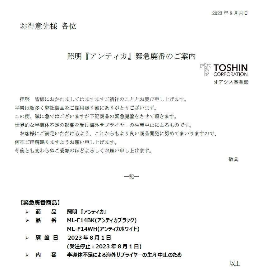2023.08.01 照明『アンティカ』緊急廃番のご案内